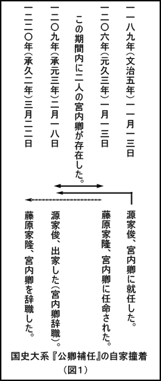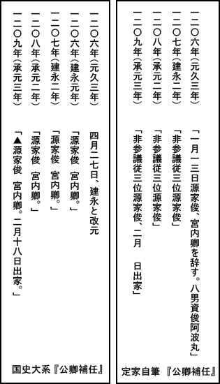 左の二つの表を見ると、はっきり分かるのであるが、藤原定家自筆の『公卿補任』においては、1206年(元久3年)1月13日に源家俊が宮内卿を辞職したから、翌年の1207七年(建永2年)、源家俊はただの非参議従三位と記されている。次の1208年(承元2年)も然りである。国史大系『公卿補任』を見ると、1206年(建永元年)、1207年(建永2年)、1208年(承元2年)と源家俊は連続して宮内卿であり、1209年(承元3年)2月18日に彼が出家するまで、ずっと宮内卿であったことになる。この異なる記載を単純に写し間違いであると片付けることはできない。