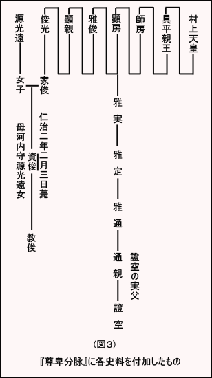 また定家自筆『公卿補任』を見ると、源家俊(正月十三日辞宮内卿八男資俊阿波丸)と記されている。また『尊卑分脉』を抄出し、各史料を付加すると(図3)のような家系である。